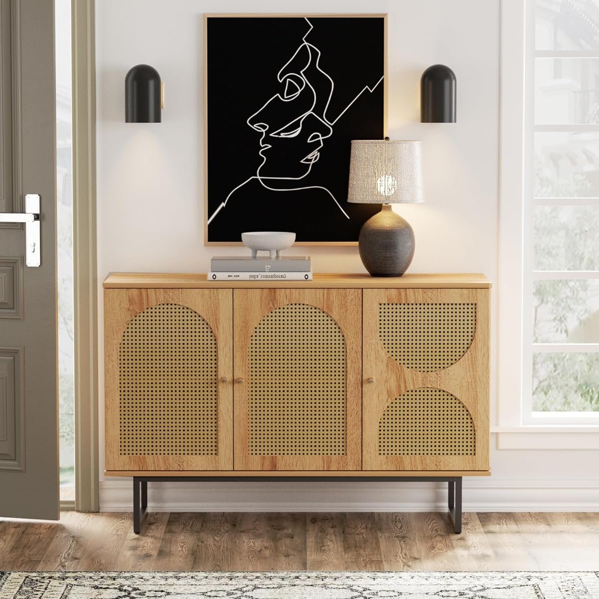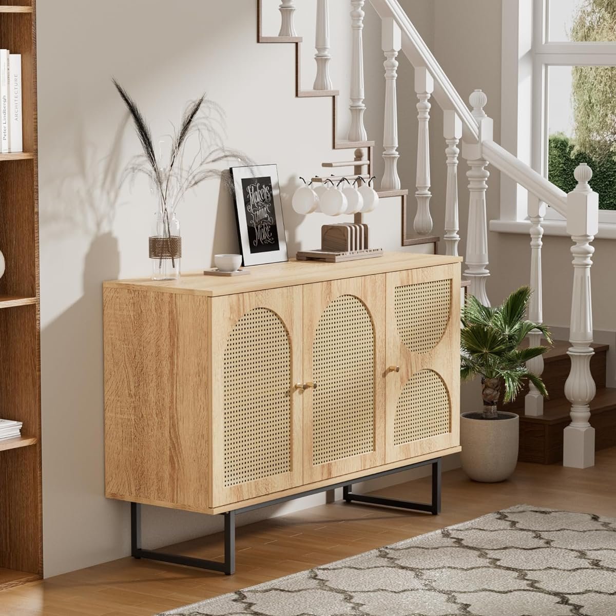 يتميز البوفيه بتصميم داخلي فاخر يجمع بين أنماط الطبيعة يمكن استخدامه في غرف الطعام لعرض الأواني الزجاجية والملحقات، أو في غرف المعيشة لعرض الكتب والديكورات. بفضل توفيره لمساحة تخزين كبيرة ومظهره الجميل، يعتبر البوفيه الخشبي إضافة مميزة لأي منزل.”
