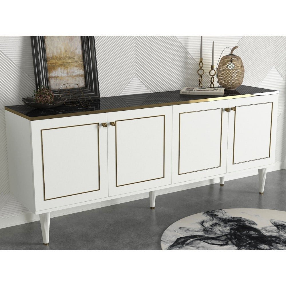 خزانة طعام بتصميم كلاسيكي فاخر . عزز ديكور منزلك أحصل على قطعة أثاث ساحره بتصميم عملى لأنه بالمساحه الداخليه الواسعه تتيح لك تخزين أكبر قدر من أوانى الطعام و المستلزمات الاخرى مع سطح خشبي ناعم يمكنك تزيينه ببعض القطع الديكوريه و التحف الفنيه يأتى باللون الأبيض و مقاس عرض 180 سم – 40 سم – الارتفاع 76 سم ..