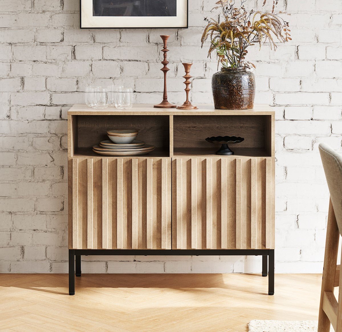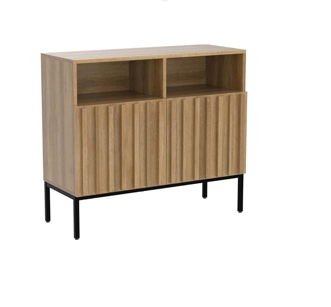 بوفيه كلاسيكى بنمط أنيق و مميز بلمسه من الطابع الريفى . يأتى بتصميم متموج على الأبواب الأماميه مما يضفى مظهراً رائعاً .مع سطح خشبى ناعم ذو مساحه كبيره يمكن أستخدامه لعرض الزهور و التحف الفنيه و الصور التذكاريه . مع أرجل معدنيه باللون الأسود تدعم الثبات و الأستقرار للبوفيه