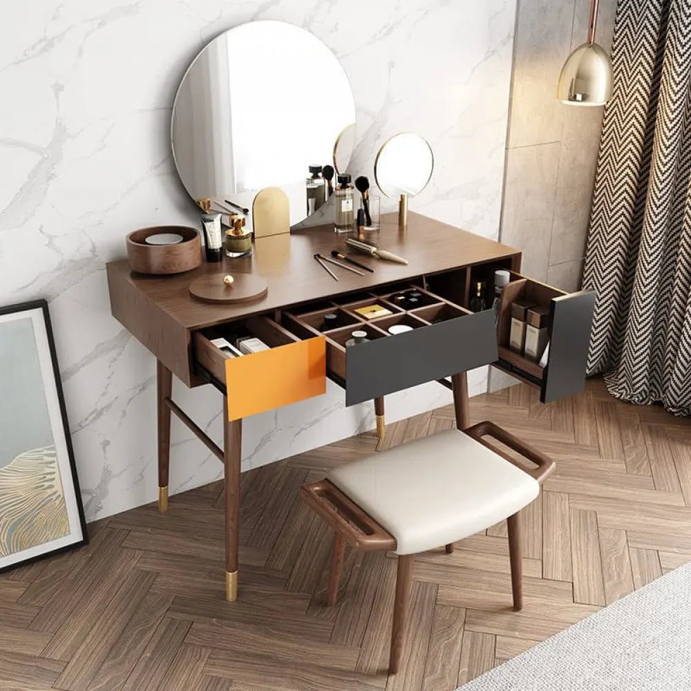 تسريحة مع خزانة خشبية بتصميم اسكندافى بسيط مصنوع من اجود انواع الخشب ام دي اف متاح مع الكرسي ومرآة. و متوفره ب اللون البني و مقاس ( التسربحة: العمق 53 سم * الارتفاع 75 سم * العرض100 سم _ الكرسي: العمق 32 سم * الارتفاع 40 سم * العرض 58 سم )