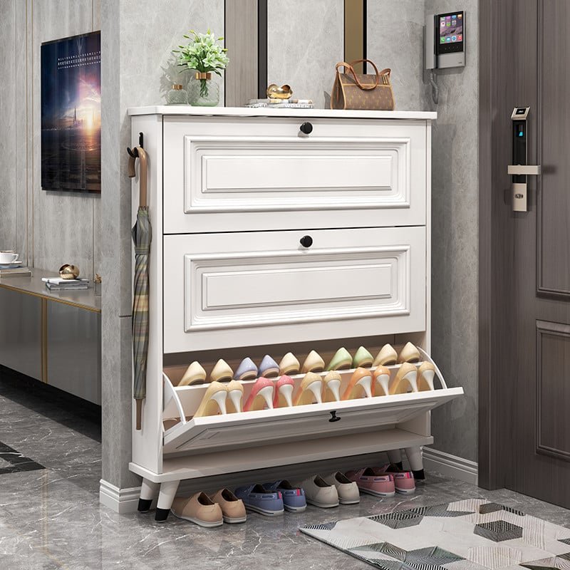 تتميز هذه الخزانة الأنيقة وذات الجودة العالية بتصميمها المميز الذي يلفت الأنظار. تم تصميمها بعناية فائقة لتتناسب مع أي ديكور داخلي، حيث تأتي باللون الأبيض الأنيق الذي يعزز الأناقة والنظافة في المكان.تتكون الخزانة من ثلاثة أدراج قلابة تمنحها سعة تخزين كافية للأحذية. تم تصميم الأدراج بشكل فريد وعملي لتسهيل عملية وضع وإخراج الأحذية بسهولة ويسر. ولإضفاء لمسة إضافية من الجمال والعملية، تم تجهيز الخزانة بخطاف صغير جانبي يمكن استخدامه لتعليق المفاتيح أو الاكسسوارات الصغيرة.تتميز هذه الخزانة بأبعادها المثالية، حيث يبلغ عرضها 80 سم وارتفاعها 130 سم وعمقها 30 سم. هذه الأبعاد المدروسة تجعلها مناسبة للمساحات المحدودة دون التضحية بالأداء أو الجمالية. باختصار، تجمع هذه الخزانة بين الجودة العالية والتصميم المميز الذي يلفت الأنظار. فهي ليست مجرد خزانة لتخزين الأحذية، بل هي قطعة ديكور تضفي لمسة فريدة على أي مكان توضع فيه.