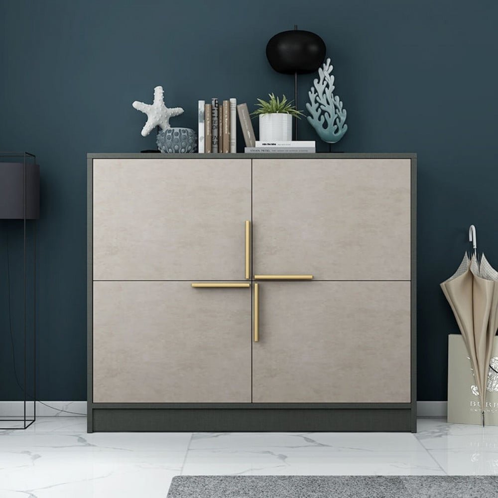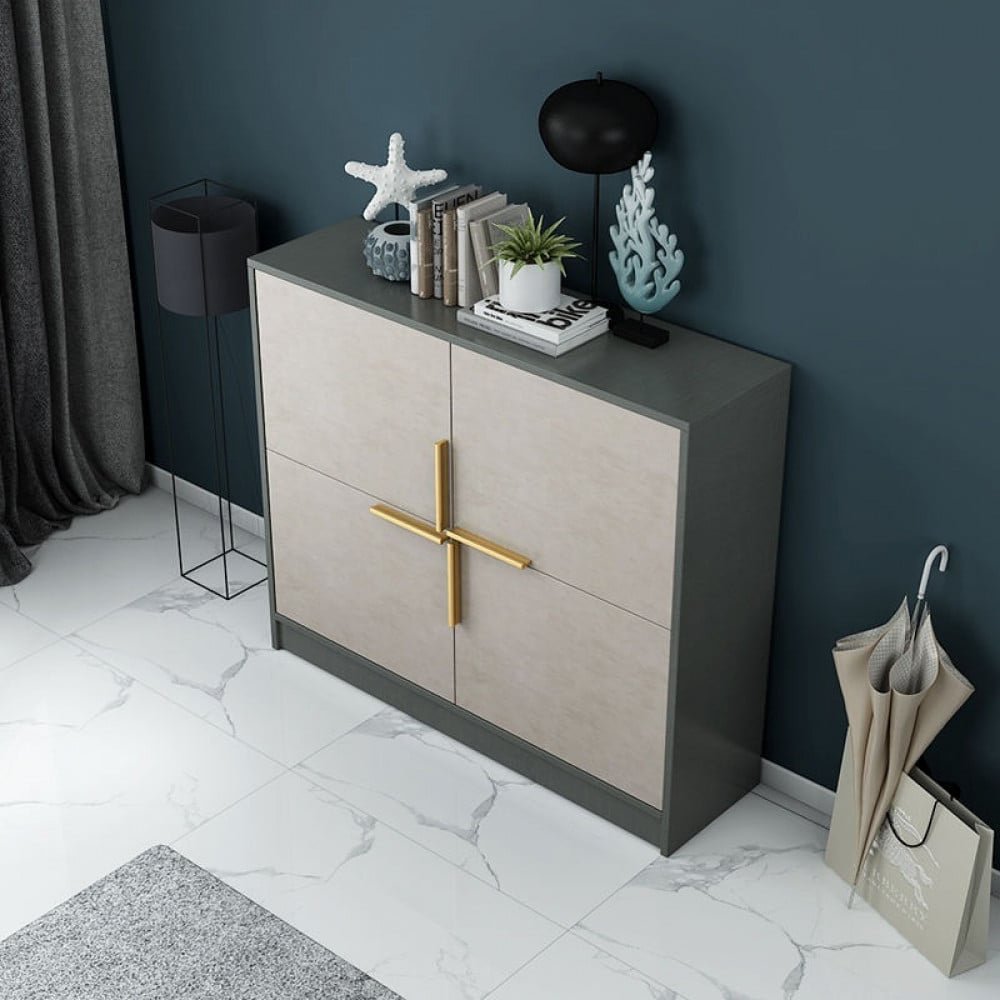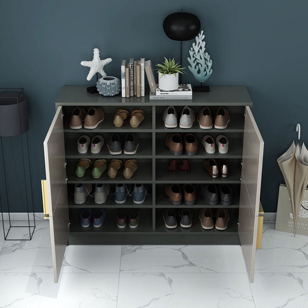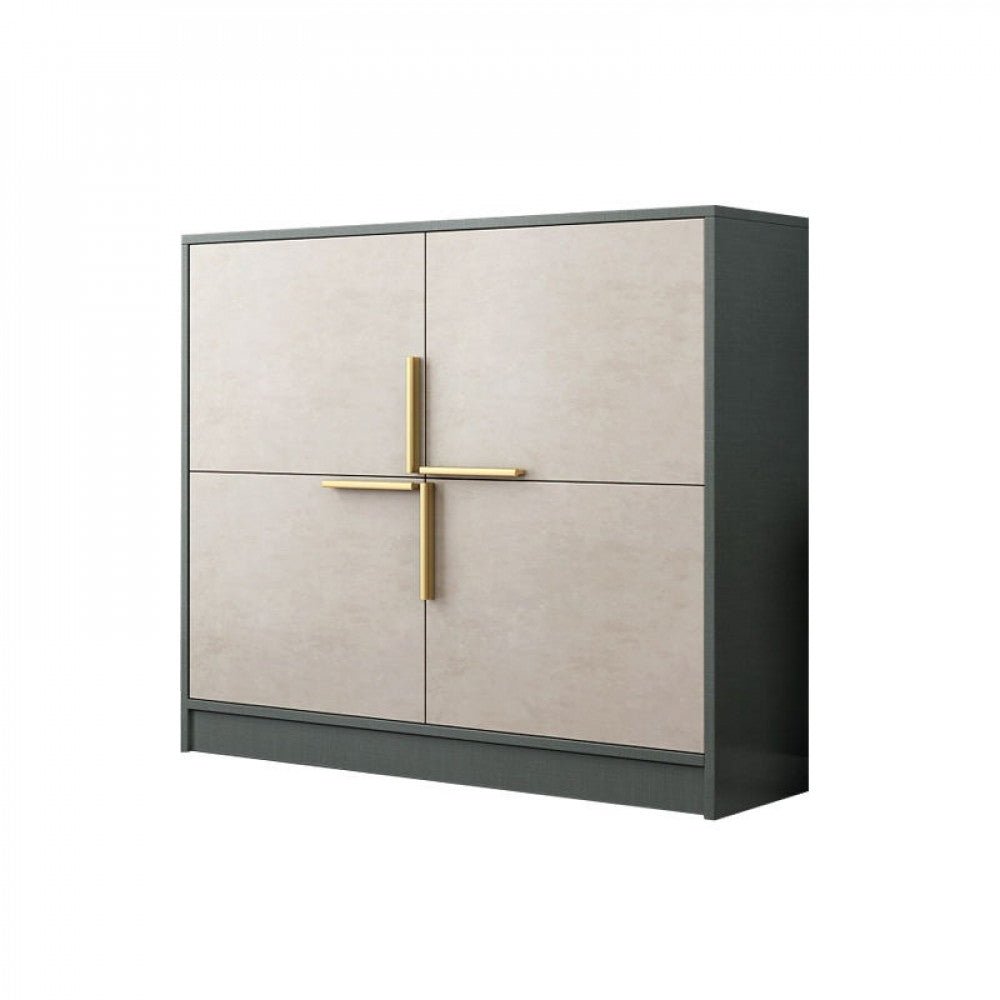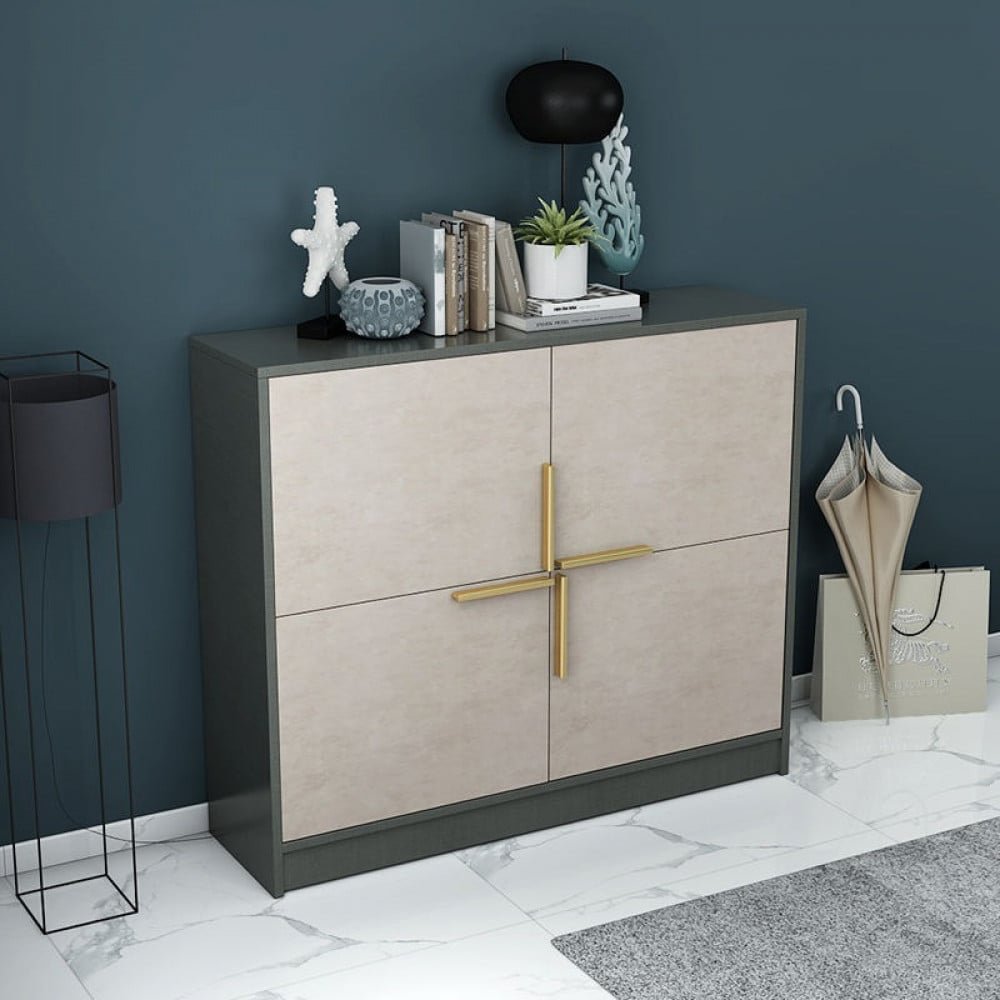 خزانة أحذية بسيطة حديثة اسكندنافية صغيرة مصنوع من اجود انواع الاخشاب ام دي اف الصلب الفاخره مع لمسات معدنيه باللون الذهبي الرائع الذي يعطي رونقاَ و تميز للخزانه , متوفر بالون الرمادي كما انه متوفر بمقاس و هو ارتفاع 100 سم و عمق 35 سم و عرض 100/120 سم و يمكن استخدامها في المنزل و الفنادق و ايضا المطاعم .