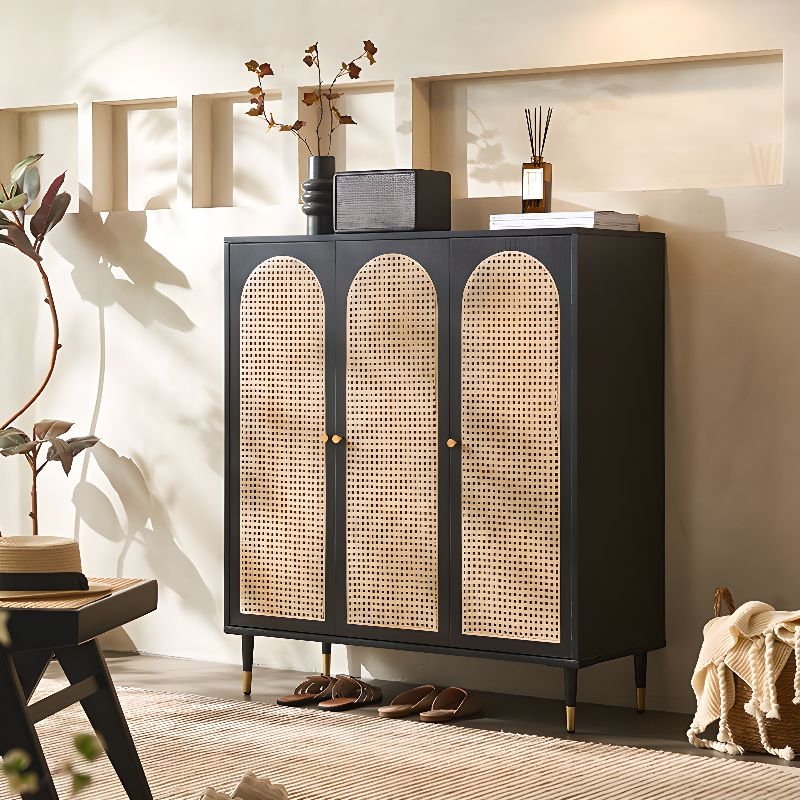 أضف لمسة من الفخامة الدافئة والعمق إلى غرفة المعيشة أو المدخل مع هذه الخزانة المتميزة. يجمع تصميمها الفريد بين الإطار الخشبي الأنيق وواجهات الأبواب التي تزينها خشب الروطان المنسوجة، مما يخلق مظهراً عصري رائع. ترتكز الخزانة على أرجل خشبيه نحيفة وذهبية، مما يرفعها عن الأرض ويضفي عليها لمسة راقية. توفر الأبواب الثلاثة سعة تخزين داخلية واسعة ومخفية، مثالية لحفظ الكتب، الأواني، أو الأغراض المنزلية المختلفة. هذه القطعة ليست مجرد خزانة، بل هي عمل فني يضيف نسيجًا مميزًا لديكورك، ومتوفرة باللون الأسود الجريء أو اللون البني الدافئ لتختار ما يناسب ذوقك الرفيع.