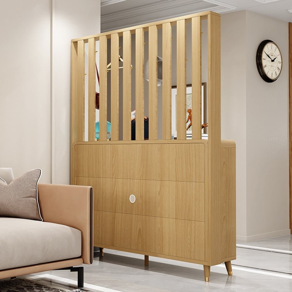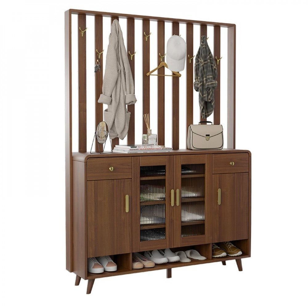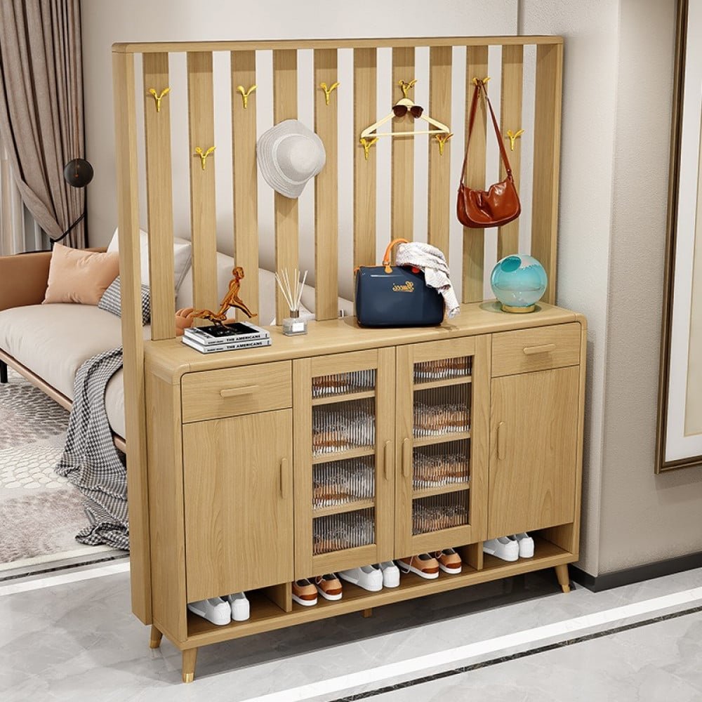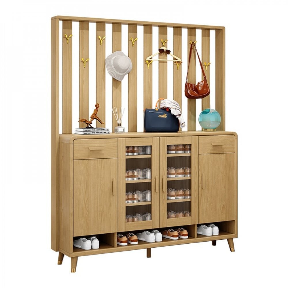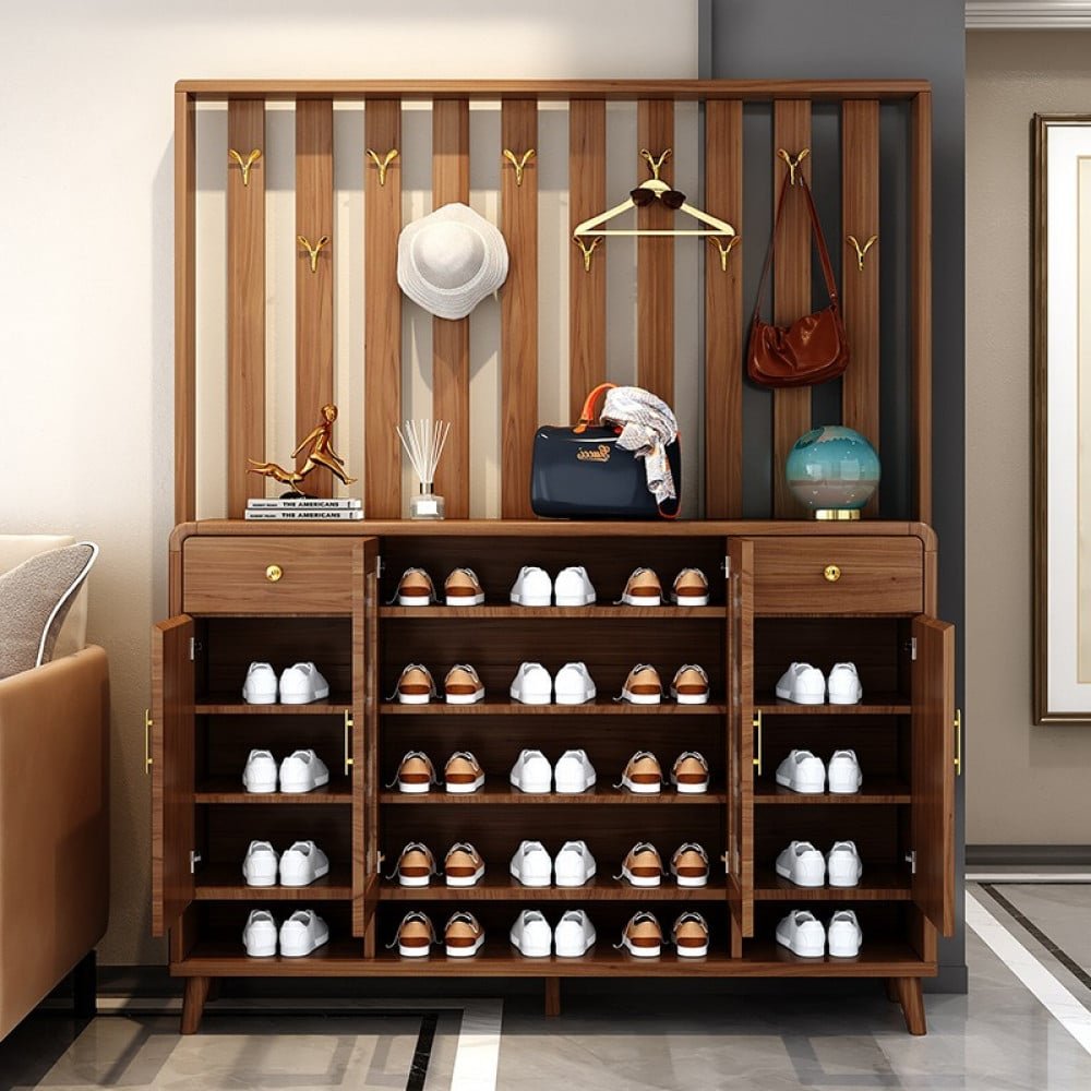 هذا المنتج هو منتج متكامل يتكون ثلاث درف واسعه المساحه من الداخل لترتيب الاحذيه ورف مفتوح من الاسفل . ودرجين من اعلي . وسطح خشبي متين. وعلاقه للملابس ف هو منتج متكامل من كل شئ و سوف يكون إضافه رائعه الي منزلك و متوفره ب اللون الخشبي الفانح و الخشبي الداكن و مقاس ( الارتفاع 195.5 سم * العرض 143.5 سم * 35 سم )