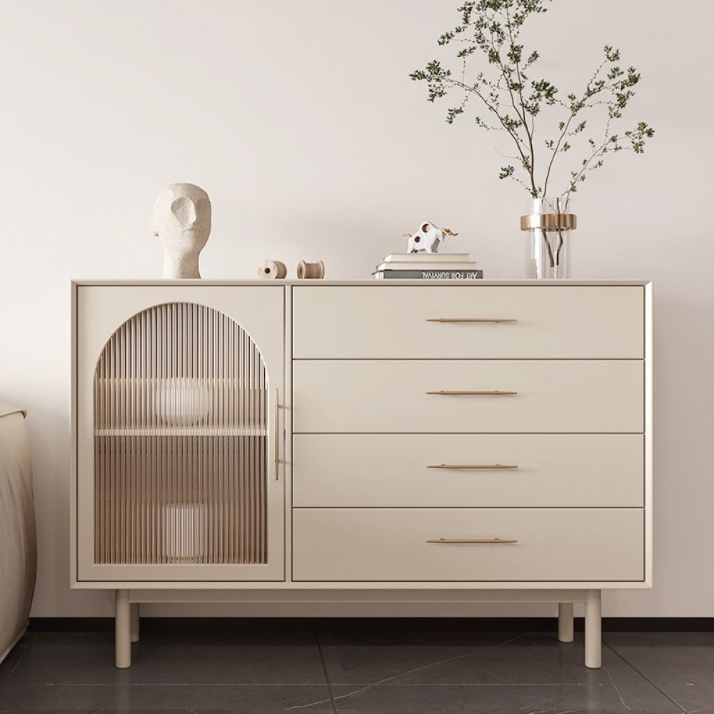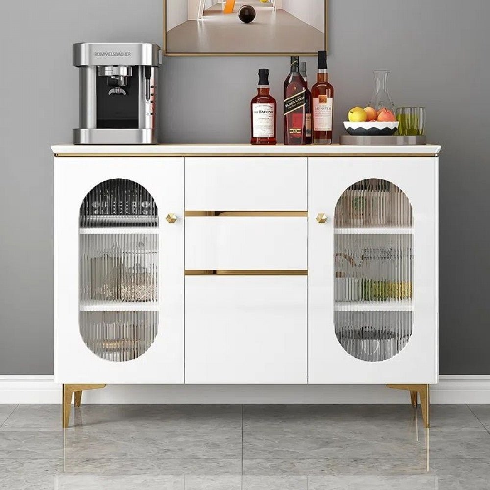 خزانة جانبية فاخرة مصنوعه من خشب MDF عالي المتانه . و ذات درفتين بواجهه زجاج . وارجل من الفولاذ المقاوم للصدأ بتصميم أنيق وكلاسيكي وصممت باللون الابيض كي تناسب جميع أشكال الديكور و مقاسات ( الارتفاع 95 سم * العمق 40 سم * العرض 120 / 139 سم )