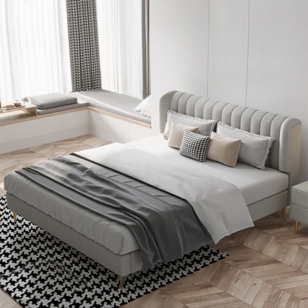 سرير غرف نوم بتصميم بسيط مصنوع من اجود خامات القماش و الخشب الصلب و متاح باللون الرمادي الفاتح والرمادي الغامق والوردي و متوفر بمقاس ارتفاع 113 سم و عرض 140-160-180-200 سم و عمق 200 سم و يمكن استخدامها في المنزل و الفنادق