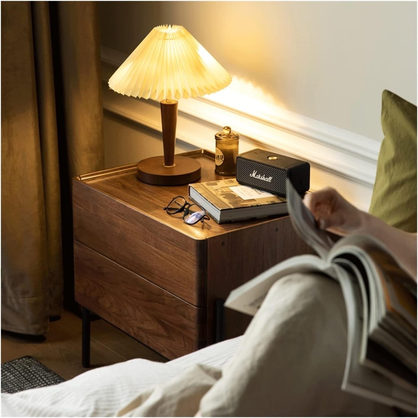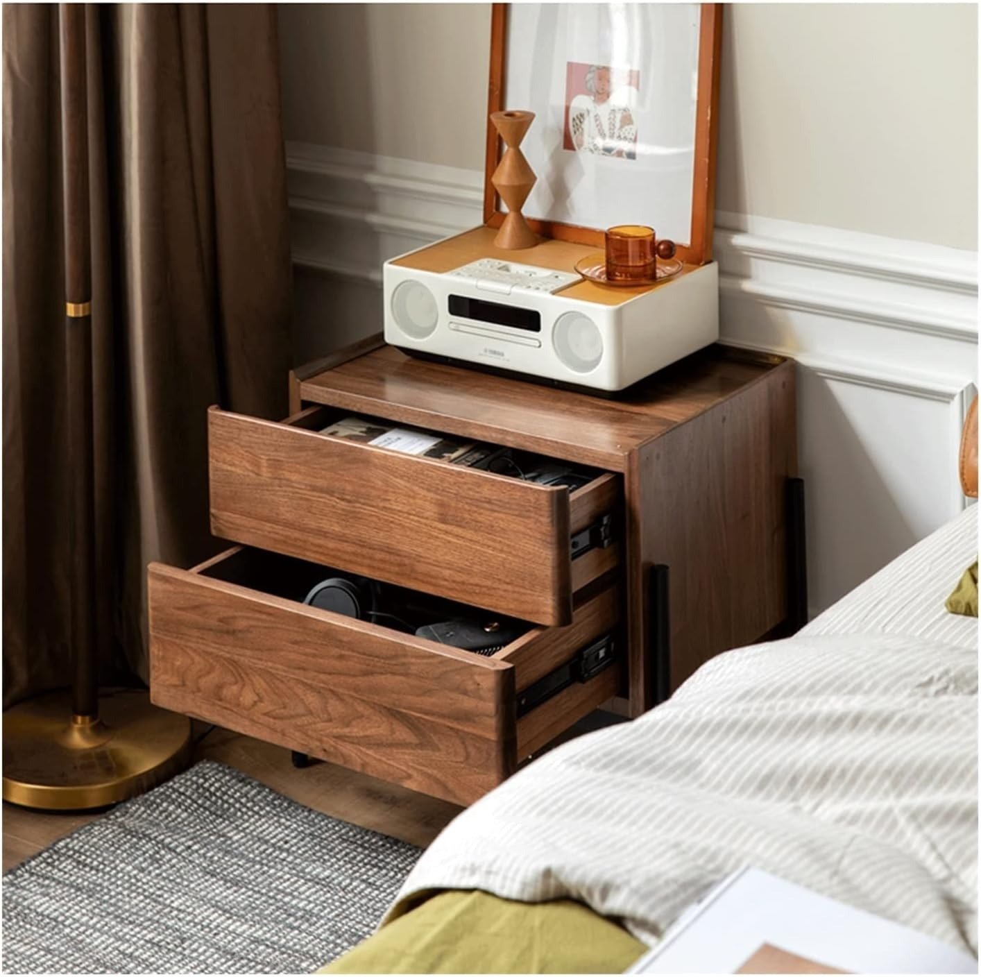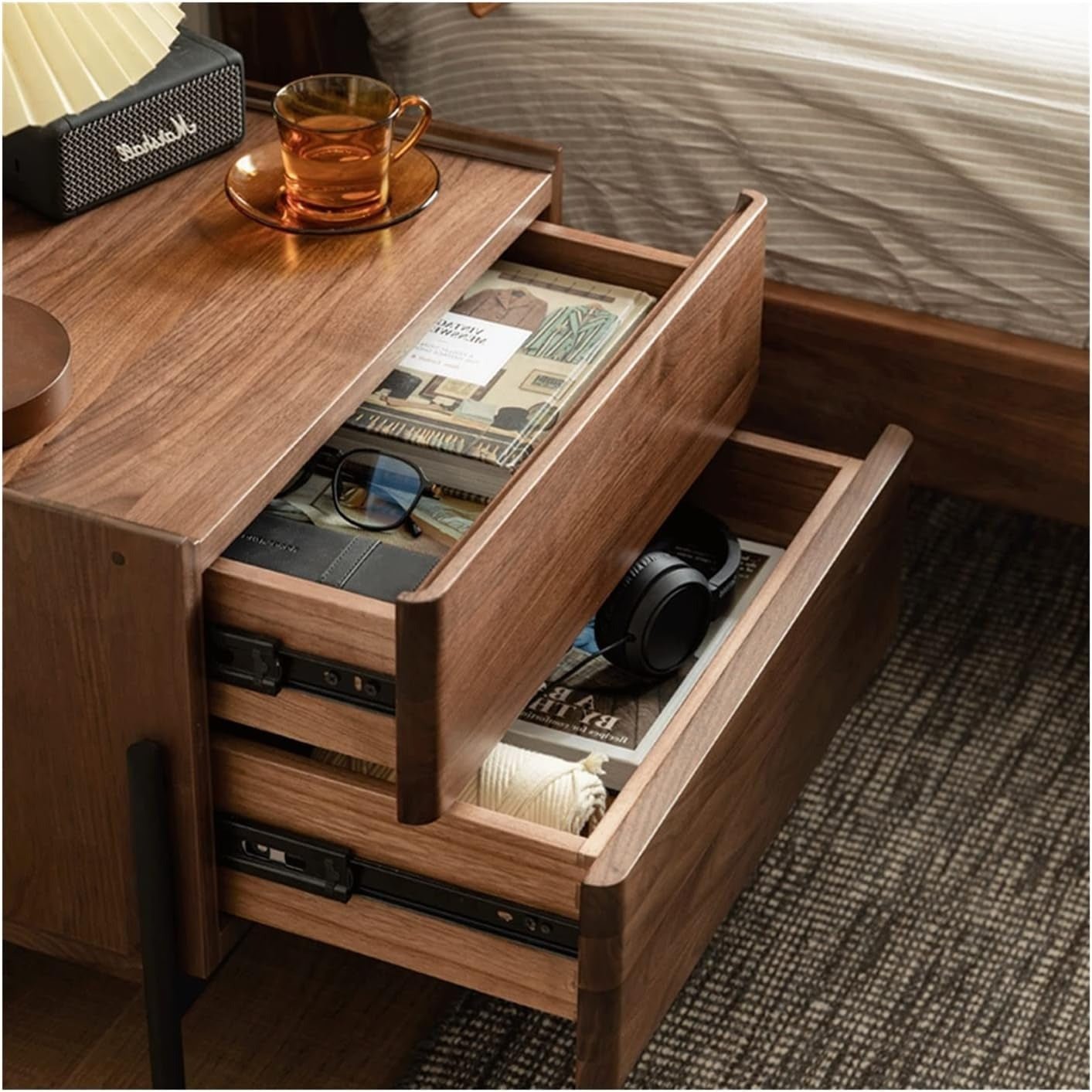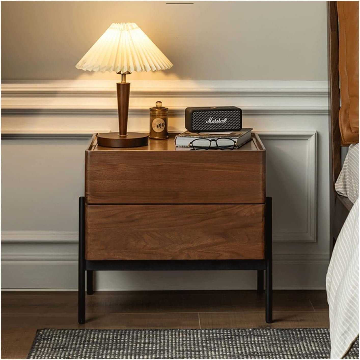 طاولة جانبية بتصميم أنيق يجمع بين دفء الخشب الطبيعي وأناقة القاعدة المعدنية السوداء، تمنح لمسة فخمة لغرفة النوم أو المعيشة. تحتوي على درجين واسعَين لتخزين الأغراض الشخصية أو الكتب، مع سطح علوي مثالي لوضع المصباح أو الإكسسوارات. تصميمها البسيط والعصري يجعلها قطعة عملية تضيف لمسة من الرقي والتنظيم للمكان.