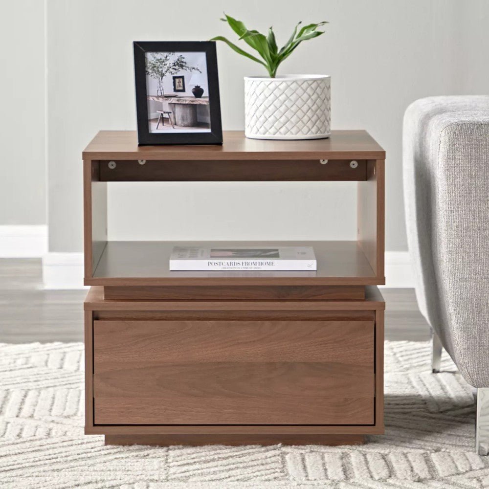 طاولة جانبية بسيطة وأنيقة. تتناسب مع أي ديكور منزلي. مصنوعة من مواد عالية الجودة. متينة وقابلة للاستخدام لسنوات عديدة. يمكن استخدامها كطاولة جانبية في غرفة المعيشة أو غرفة النوم. يمكن استخدامها لوضع المشروبات أو الكتب أو الديكورات. يمكن استخدامها كطاولة قهوة صغيرة. تتميز بسطح ناعم و سهل التنظيف و رف مفتوح للخلف لسهولة تخزين الاشياء طويلة الحجم . و بها درج تخزيني سفلى بمساحة كبيرة لتخزين جميع الادوات و الاغراض . و تأتى بمقاس ارتفاع 55 سم و عرض 55 سم . و تأتي بلون خشبى بنى .