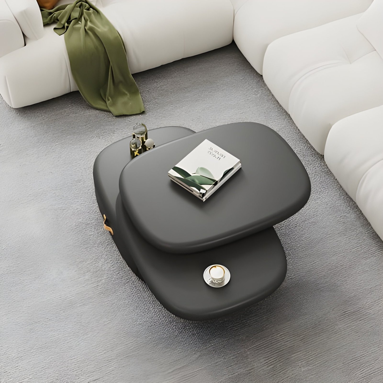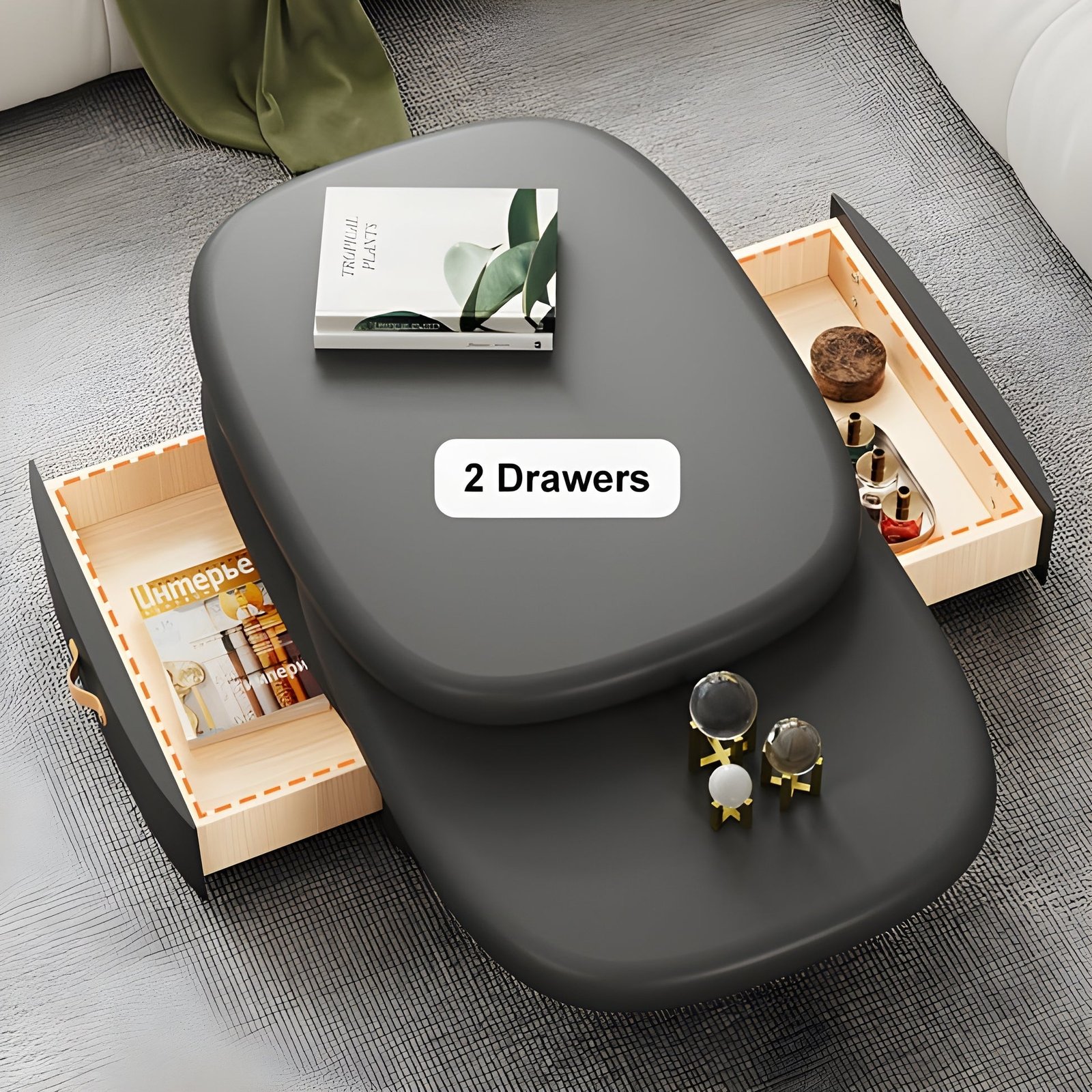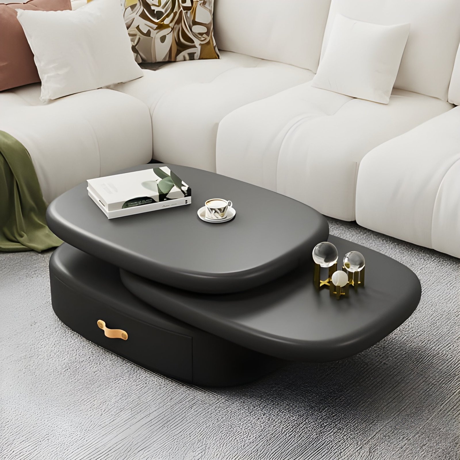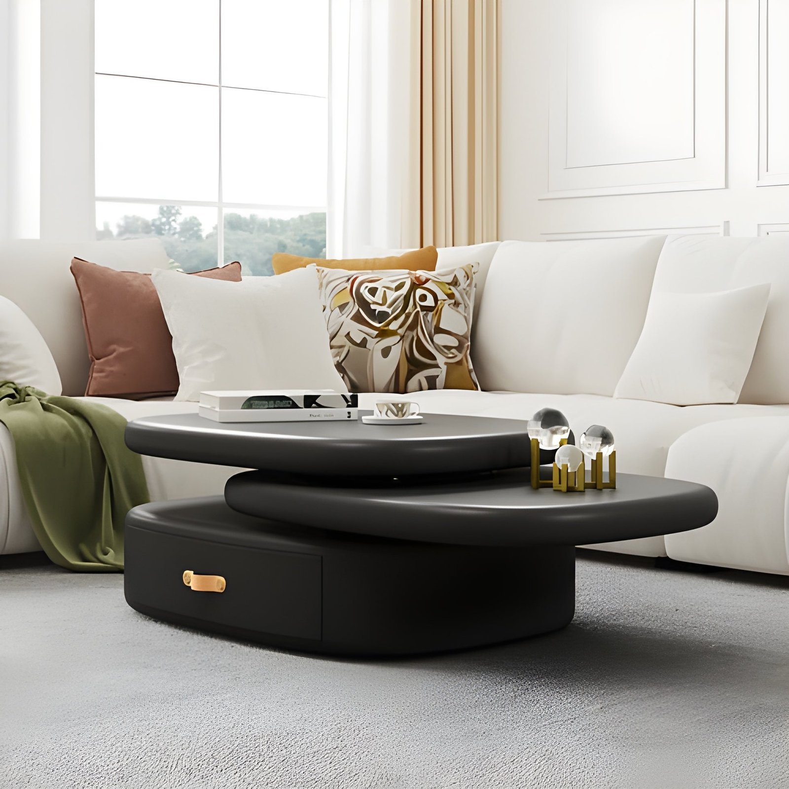 طاولة قهوه بتصميم حديث مختلف عن باقى طاولات القهوه التقليديه . كما ان تصميمها القابل للدوران منحها لمسات مبهره . و بالإضافه الى تصميمها الرائع ف أيضاً تم النظر اليها من الناحيه العمليه وتوفير بها درجين ذات مساحه داخليه واسعه لتوفير أكثر من غرض من الاغراض الشائعه فى غرفة المعيشه