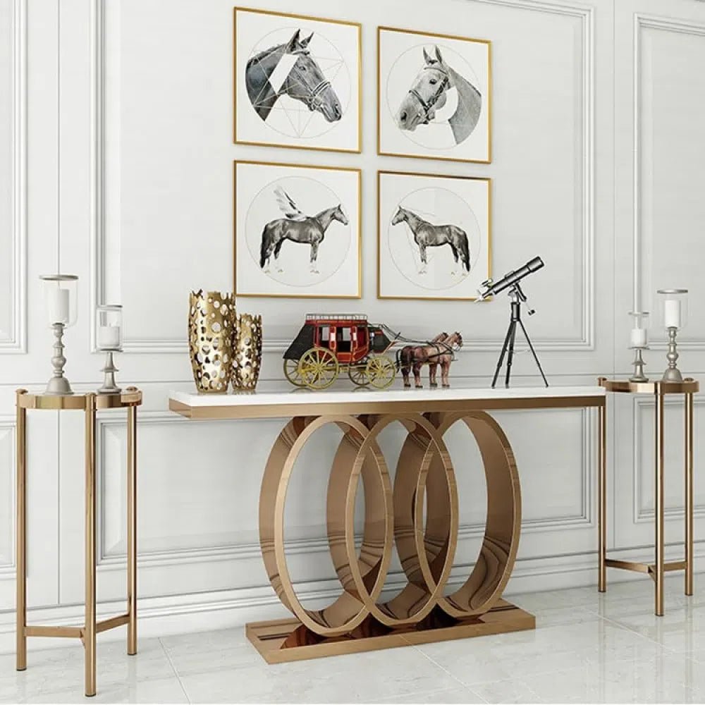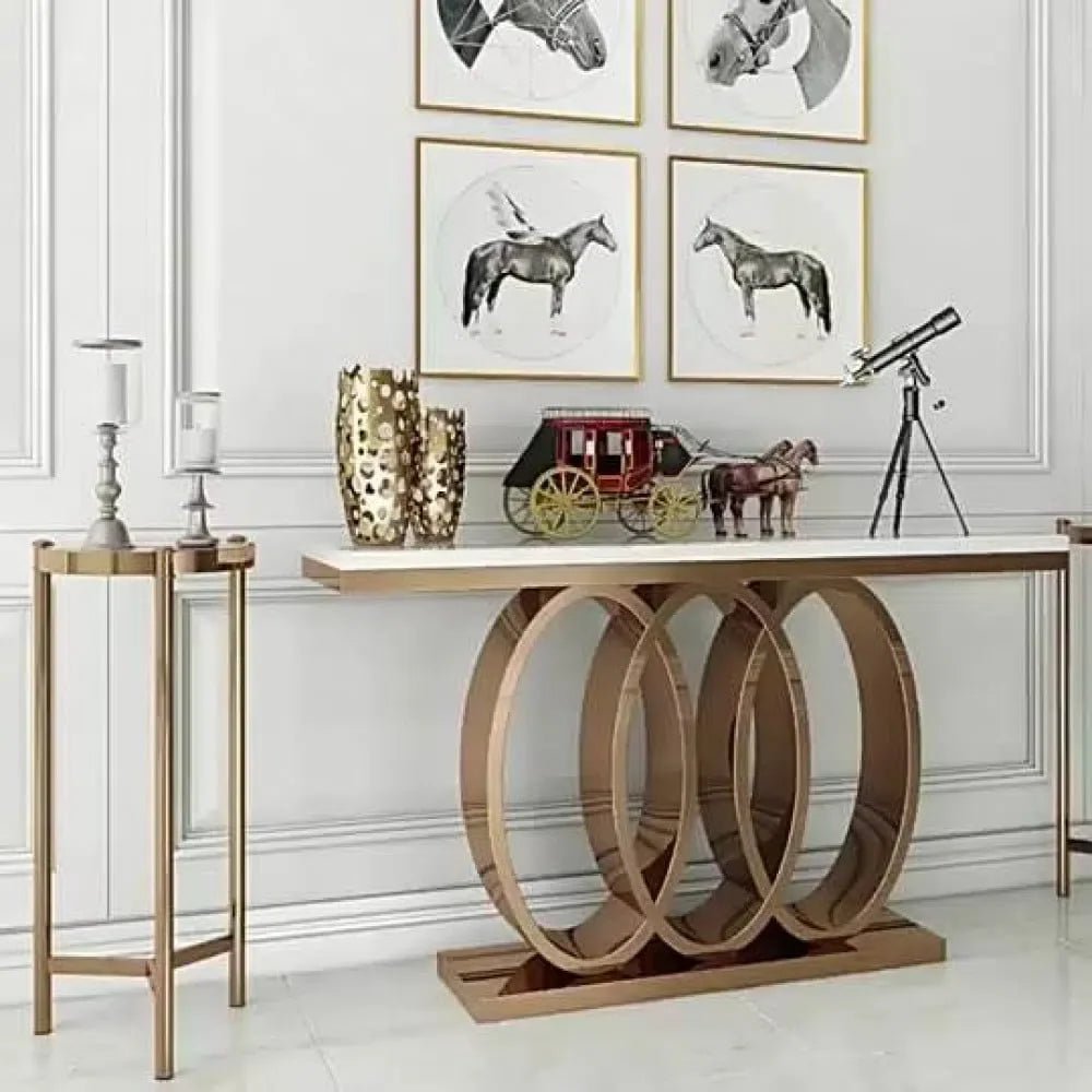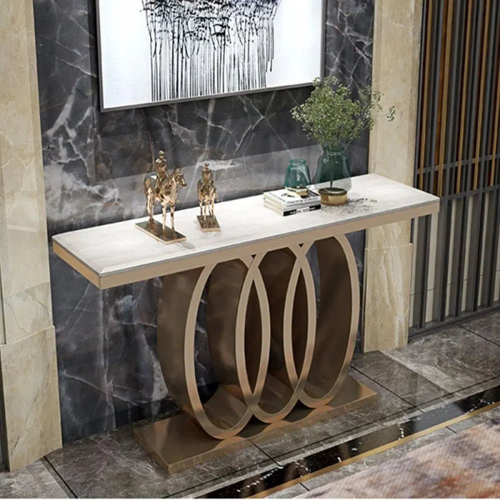 طاولة مدخل عصرية، يتميز بتصميم بسيط وعصري. يتكون الإطار من المعدن المتين والسطح من الرخام الفاخر باللون الذهبي مع الأبيض.
