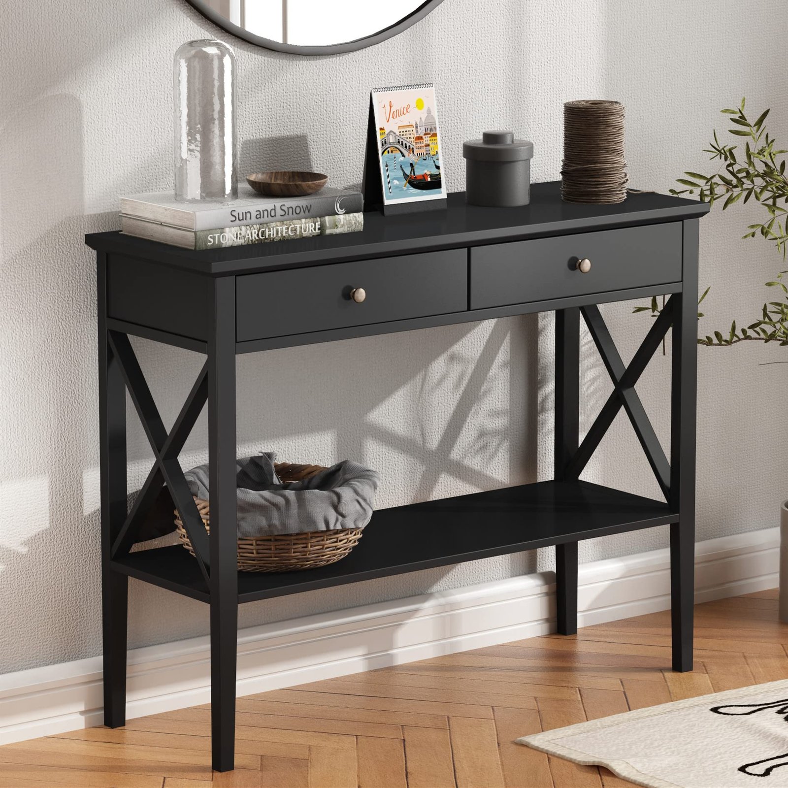 طاولة مدخل أنيقة وعصرية باللون الأسود تضيف لمسة من الفخامة إلى مساحة مدخلك. تتميز بتصميمها العملي الذي يضم درجين واسعين لتوفير مساحة تخزين مثالية للأغراض اليومية مثل المفاتيح، المحفظة، أو الأدوات الصغيرة. مصنوعة من مواد عالية الجودة لضمان المتانة وطول العمر، وتتميز بلمسة نهائية ناعمة تعكس الذوق الرفيع. بفضل تصميمها المدمج والبسيط، تتناسب بسهولة مع مختلف الأنماط الديكورية، مما يجعلها الخيار المثالي لتنظيم مدخلك بأسلوب راقٍ