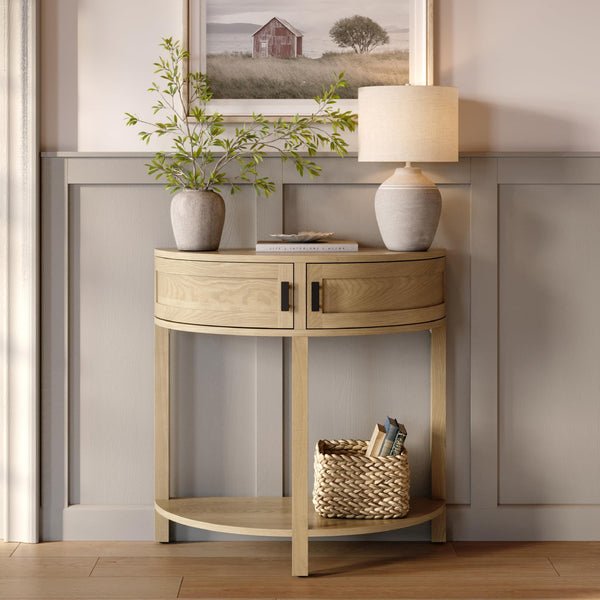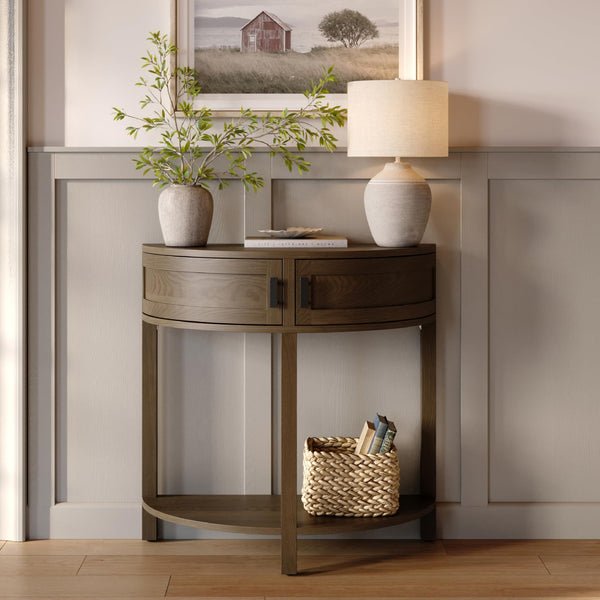 أضف لمسة راقية لمنزلك مع هذه الطاولة الكونسول الخشبية الأنيقة، التي تتميز بتصميم نصف دائري يجمع بين البساطة والفخامة، مما يجعلها مثالية للمدخل، الممرات، أو أي زاوية تحتاج إلى لمسة ديكورية مميزة. مصنوعة من خشب عالي الجودة لضمان المتانة والثبات، وتأتي مع درجين أنيقين لتخزين المستلزمات الصغيرة، بالإضافة إلى رف سفلي يتيح لك عرض الديكورات . تصميمها العملي يناسب جميع المساحات، مما يجعلها قطعة مثالية تجمع بين الجمال والوظيفة في منزلك