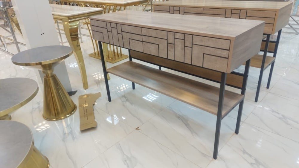 طاولة كونسول مدخل الأجمل والأفخم على الاطلاق كونها تجمع بين البساطة في التصميم مع وجود بعض التفاصيل التي تضفي لمسات من الفخامة على الديكور المحيط، مزودة بدرجين لوضع المفاتيح والبطاقات ورف سفلي يمكنك استخدامه في عرض قطع الكريستال التي تعكس الطابع الفخم للديكور المنزلي.