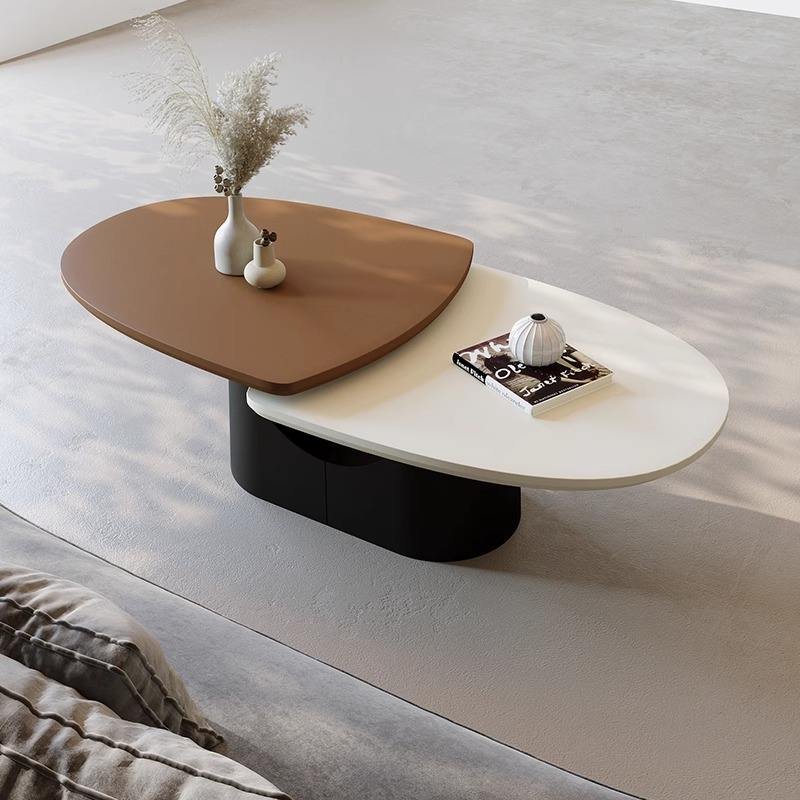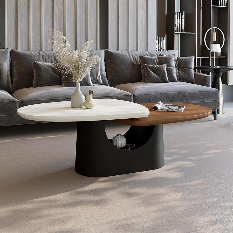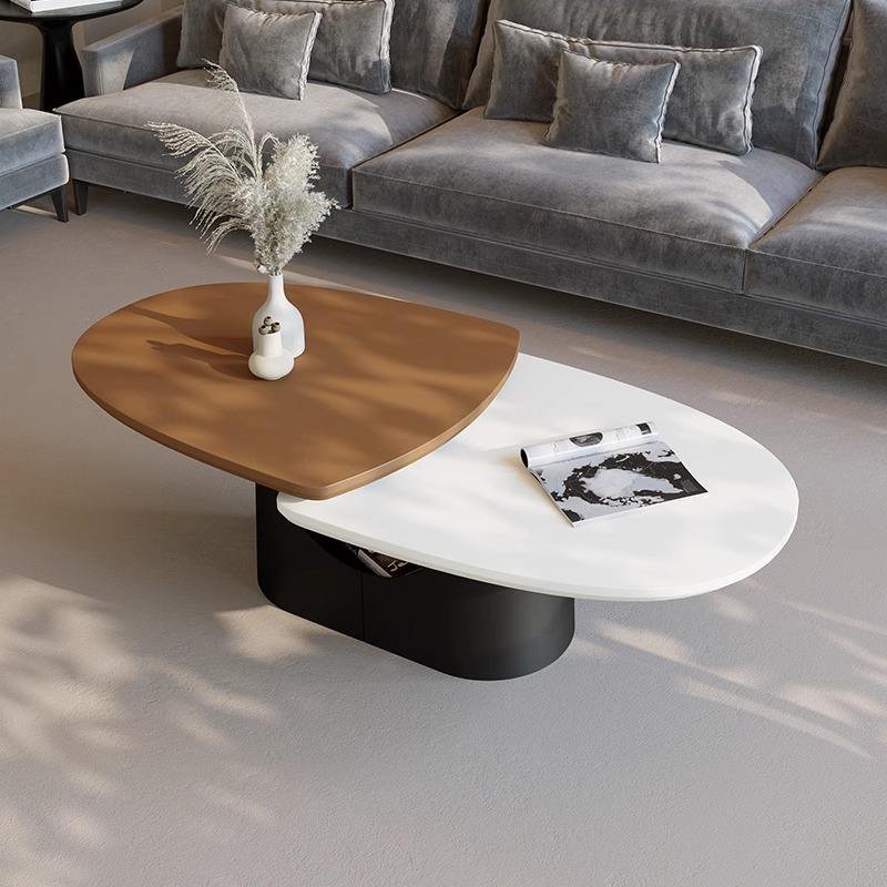 استمتع بجمالية عصرية ووظائف مبتكرة مع هذه الطاولة الوسطى الفريدة! تتميز بتصميم جريء يجمع بين سطحين بيضاويين متداخلين، أحدهما باللون الأبيض الأنيق والآخر بلمسة خشبية دافئة، يرتكزان على قاعدة سوداء منحوتة بعناية لتضفي لمسة فنية عصرية على مساحتك