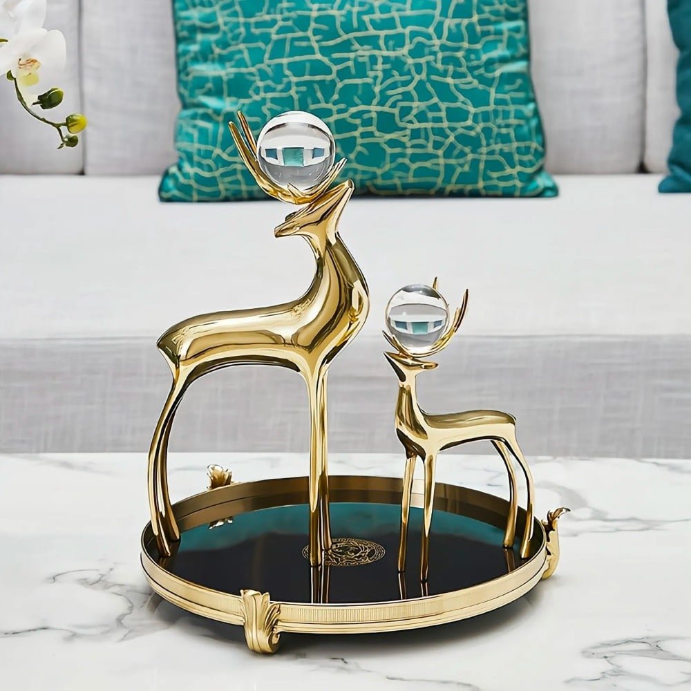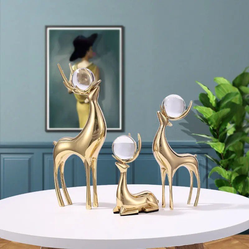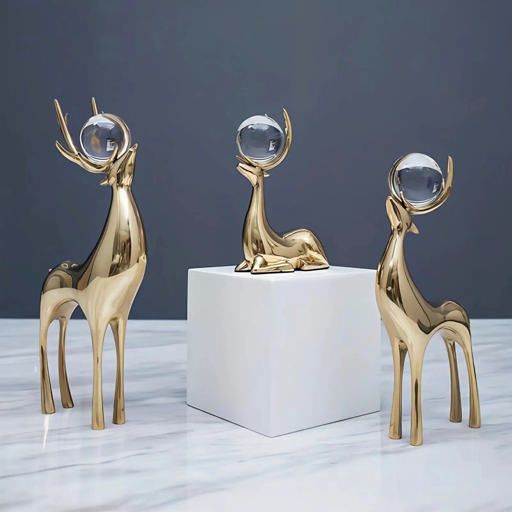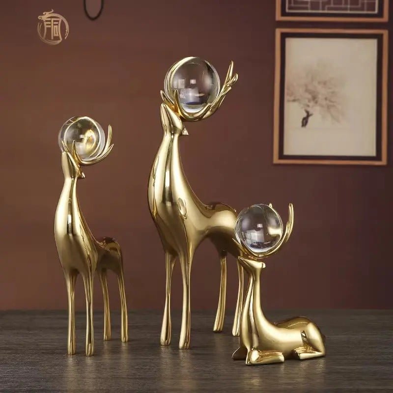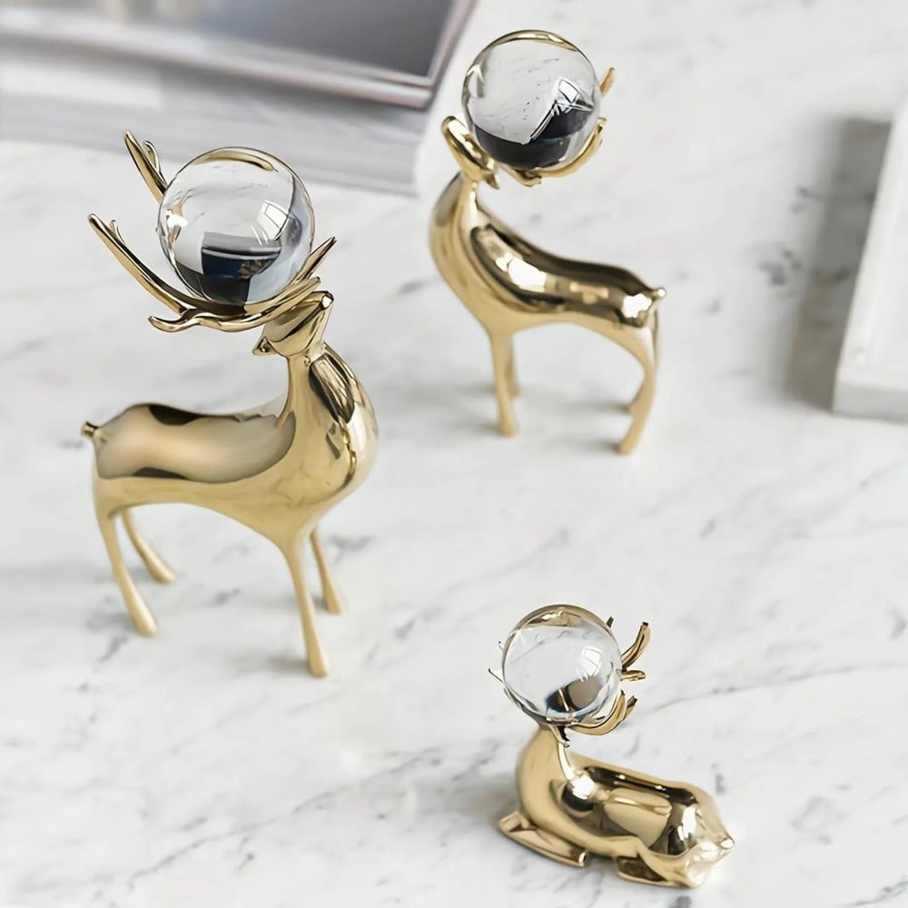 طقم ديكور بتصميم الغزلان الثلاثه حاملين كراات البلور المصنوعه من الكريستال الشفاف المتين . أما هيكل الغزلان مصنوع من النحاس . أجعل في منزلك قطع الديكور هذه و أحصل علي بعض اللمسات الساحره بوضعها علي أي سطح في أي غرفه في المنزل كما ساعد اللون الذهبي في روعة التصميم .
