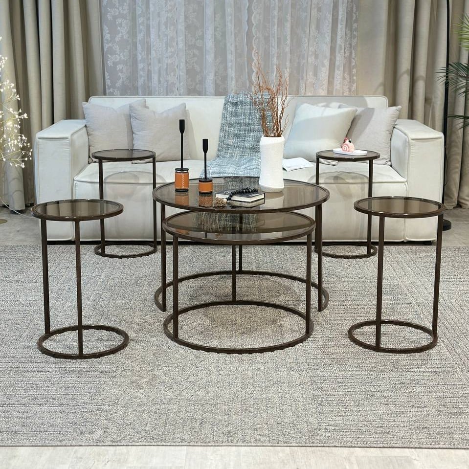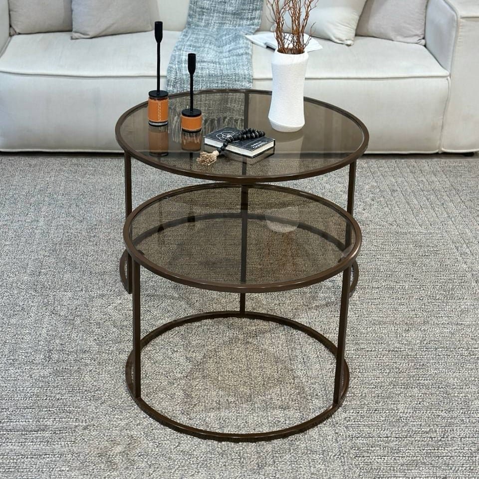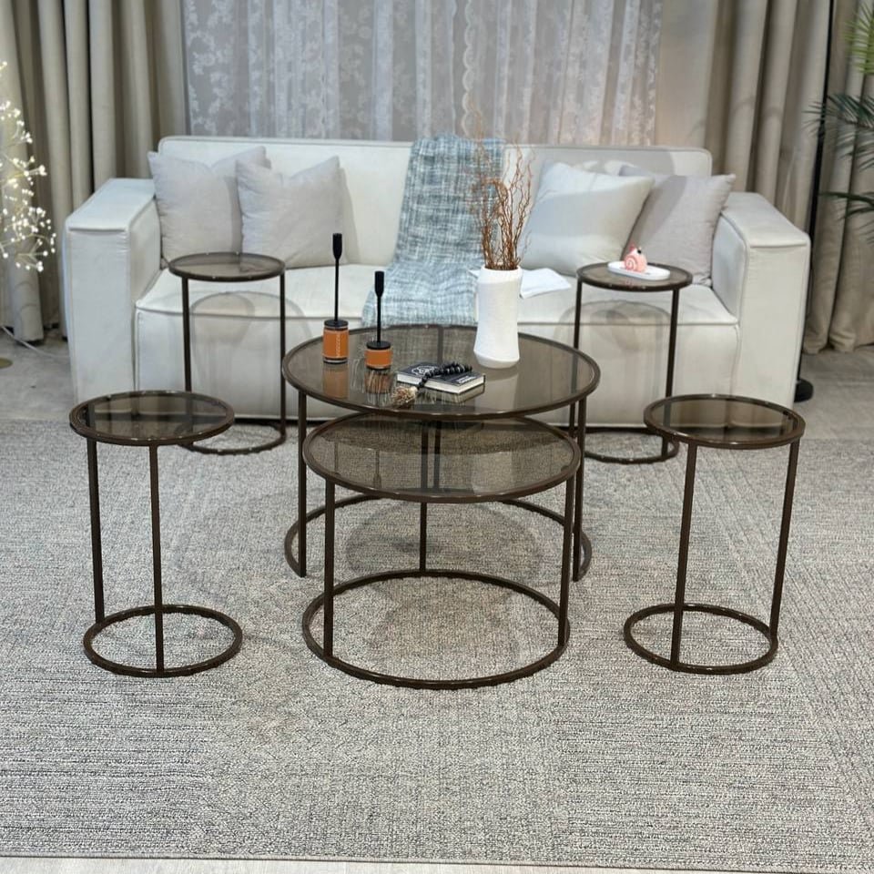 أضف لمسة من الرقي والدفء المعدني إلى مساحتك المعيشية مع هذه المجموعة المتكاملة من طاولات القهوة والخدمة. بتصميمها الشفاف الأنيق وإطارها البرونزي الساحر، تُعد هذه المجموعة إضافة مثالية لأي منزل يسعى للجمع بين الفخامة العصرية والعملية الذكية