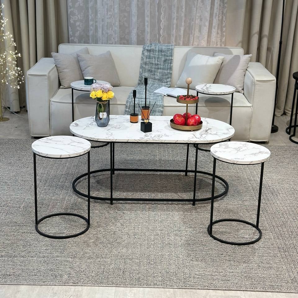 ارتقِ بمساحتك المعيشية إلى مستوى جديد من الرقي والعملية مع هذه المجموعة المتكاملة من طاولات القهوة والخدمة. بتصميمها الفريد الذي يمزج بين أناقة الرخام الأبيض والقواعد المعدنية السوداء، تُعد هذه المجموعة إضافة مثالية لأي منزل يسعى للجمال العصري والوظائف المتعددة