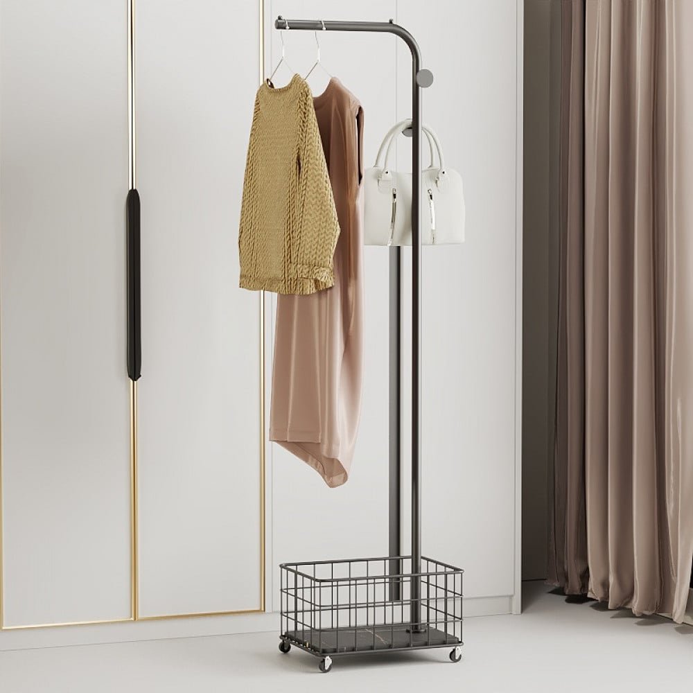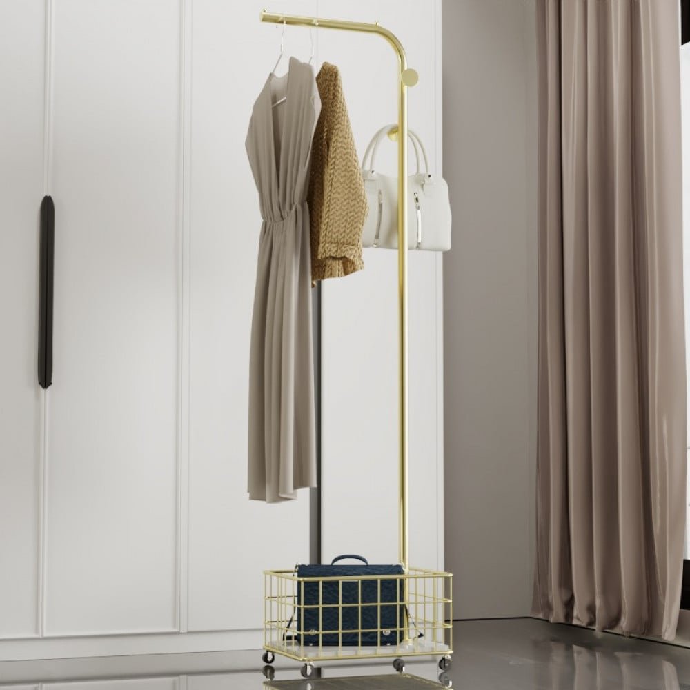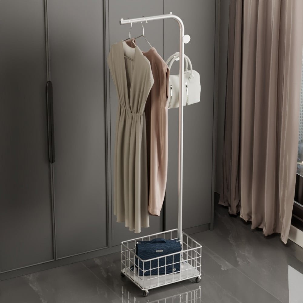 علاقه ملابس مع سله صغيره مع عجلات حتي تتيح لك تنقلها من مكان الي اخر بكل سهوله و هي مصنوعه بالكامل من أجود أنواع المعادن المقاومه للصدأ الذي لا يمكن تلفها بسهوله و تتيح لك الاختيار بين عدة الوان و هي ( اسود و ابيض و ذهبي ) و مقاس ( ارتفاع170 سم وعرض 29.5 سم وعمق 41.5 سم )