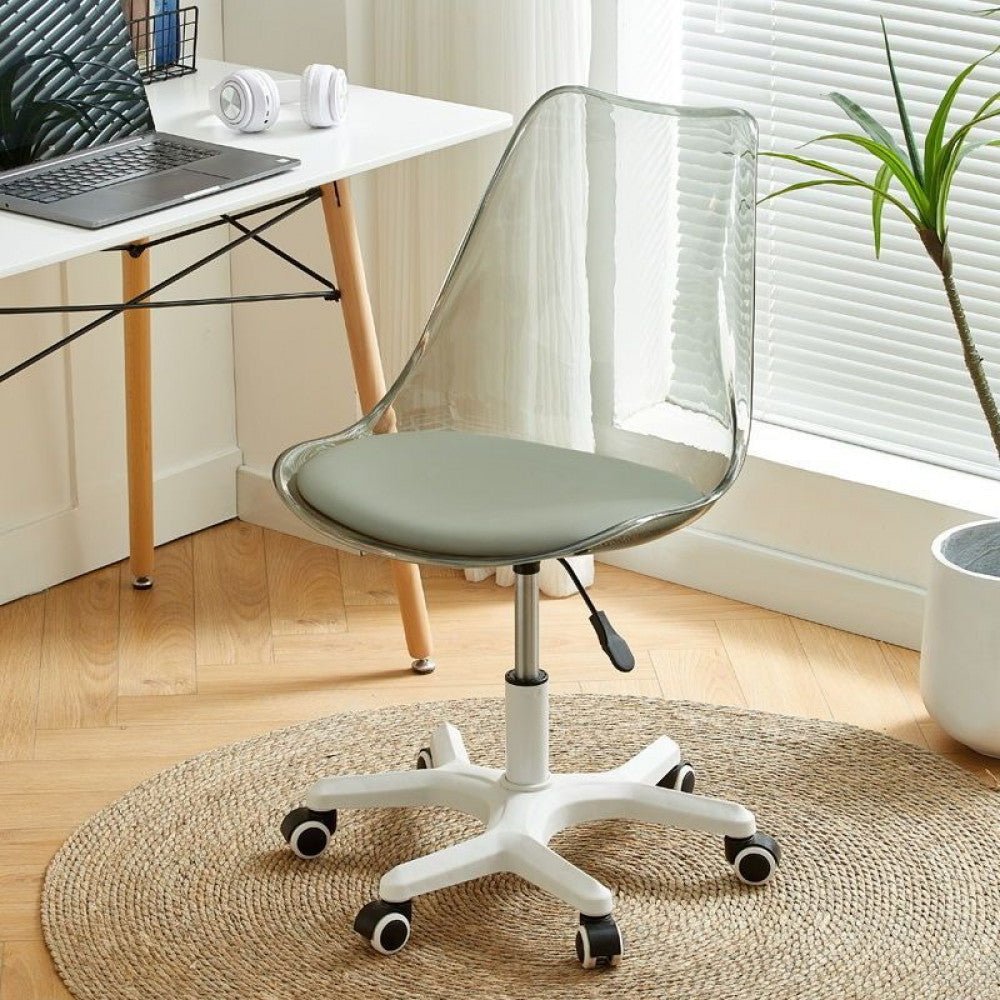 كرسي مكتب دوار حديث بنمط عصري مصنوع من اجود انواع الجلد و المعادن و ظهر شفاف من الاكليريك متاح باللون الشفاف و الرمادي و الوردي و الازرق و مقاس ( ارتفاع 73:83 سم * عرض 56 سم * العمق 43 سم )
