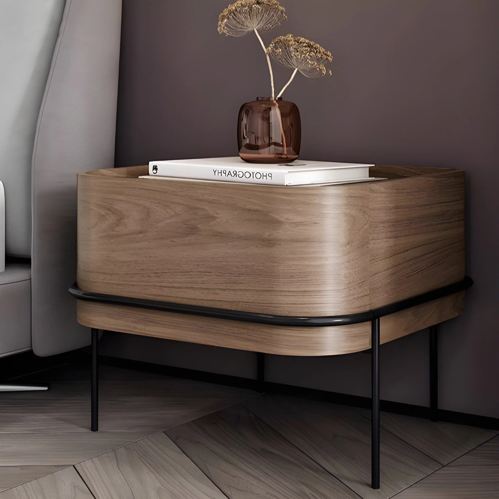 طاولة جانبية بتصميم عصري انسيابي تجمع بين دفء الخشب الطبيعي وأناقة القاعدة المعدنية الرفيعة باللون الأسود، لتضفي لمسة فاخرة ومتوازنة على أي مساحة. تتميز بحواف منحنية ناعمة تمنحها مظهرًا أنيقًا وآمنًا، مع سطح علوي عملي مثالي لوضع الكتب أو الإكسسوارات أو المشروبات. قطعة تجمع بين الجمال والوظيفة لتكمل ديكور غرف المعيشة أو النوم بأسلوب راقٍ.