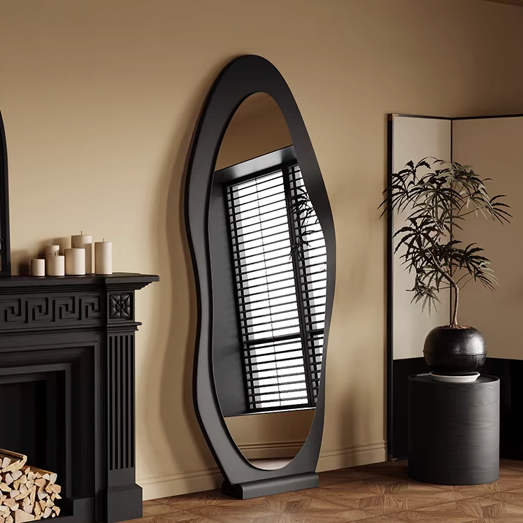 تأمل هذه المرآة الفريدة بتصميمها الانسيابي ، لتضفي لمسة من الأناقة والرقي على أي مساحة. إطارها الخشبي الداكن يبرز تفاصيلها الجمالية ويمنحها حضورًا لافتًا، بينما يعكس سطحها الأملس الضوء ببراعة ليوسع المساحة ويضفي إشراقًا طبيعيًا.
