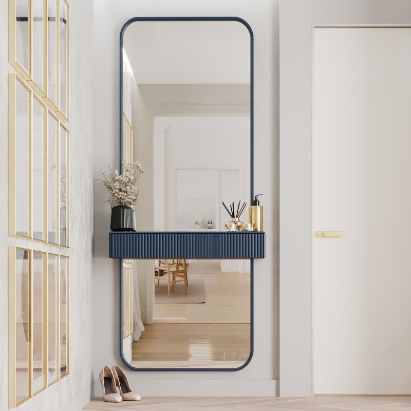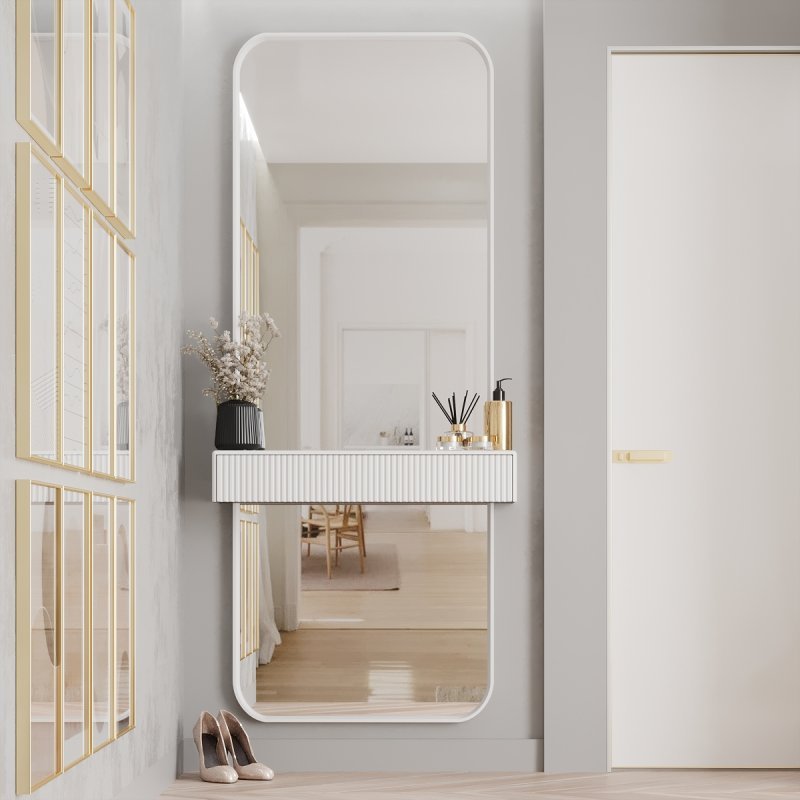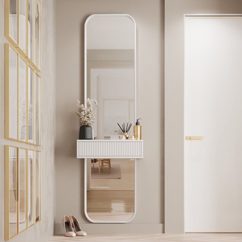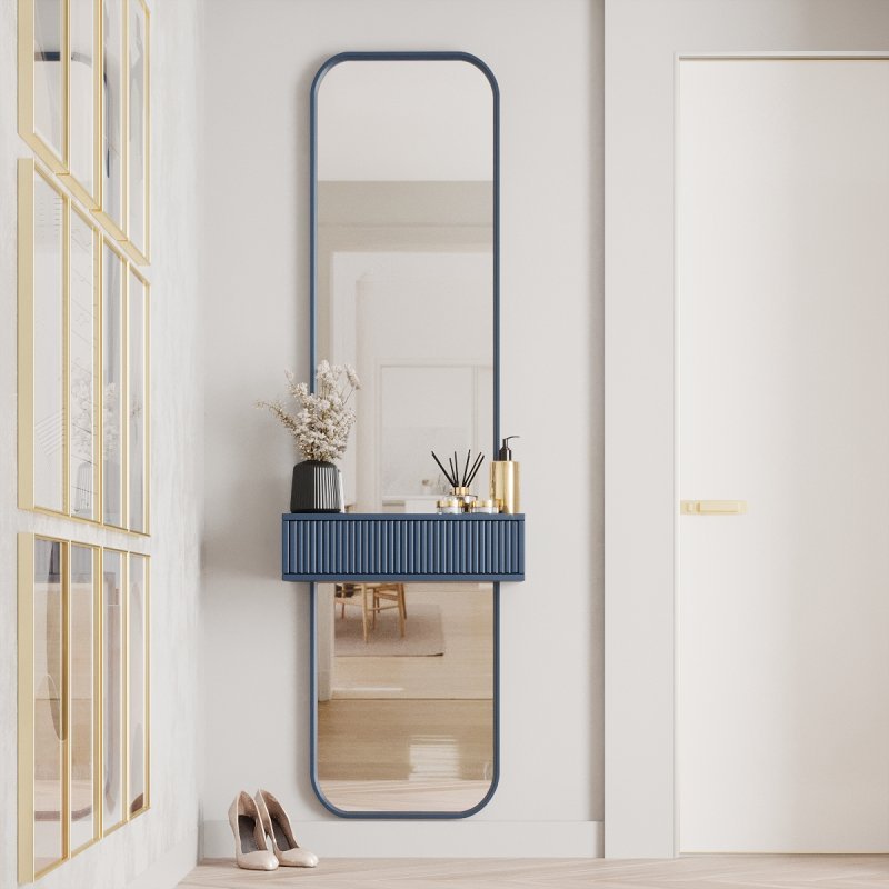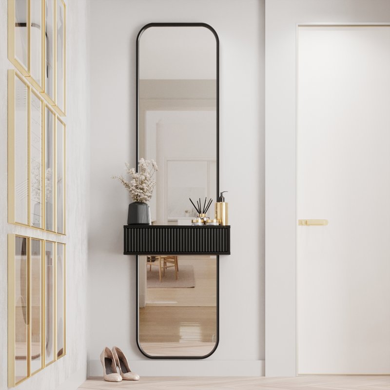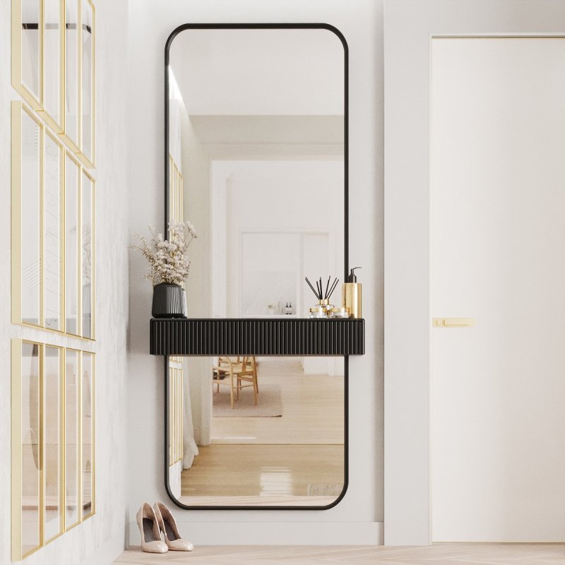أضف لمسة من الفخامة العصرية والعملية إلى منزلك بإقتناءك لهذه المرأه . تتميز هذه المرأة الأنيقة بتصميم مستطيل ذي حواف منحنية ناعمة، يضفي إحساسًا بالراحه على أي مساحة. ما يجعلها قطعة فريدة هو الرف المدمج بذكاء، والمزين بنقشة مضلعة عصرية تضفي عليه لمسة من التميز والفخامة. هذا الرف لا يضيف جمالًا بصريًا فحسب، بل يوفر أيضًا مساحة مثالية لترتيب مستلزماتك اليومية، مثل المفاتيح، العطور، أو قطعة ديكور صغيرة ترحب بك عند دخول المنزل.