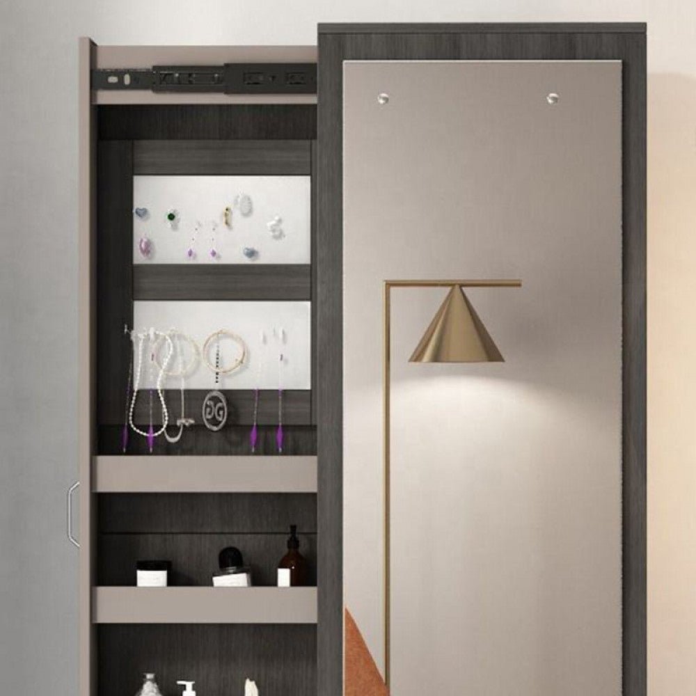 تتميز خزانة متعددة الوظائف مع مرايا هذه بتصميمها المودرن الجذاب والعصري، وتتوفر باللون الاسود لتناسب أي ديكور داخلي، . تتميز الخزانة بمقاس كبير ومناسب لتخزين العديد من اغراض المكياج او الملابس ، حيث يبلغ عرضها 60 سم وارتفاعها 180 سم . تتميز الخزانة بخامتها الرائعة والمصممة من خشب ام دي اف الذي يجعلها متينة وتدوم لفترة طويلة، كما يتميز التصميم بالعديد من الأرفف الداخلية التي تمكنك من تنظيم وترتيب الملابس او المكياج بسهولة. هذه الخزانة هي الخيار المثالي لأولئك الذين يبحثون عن خزانة متعددة الوظائف حديثة وعملية في نفس الوقت.