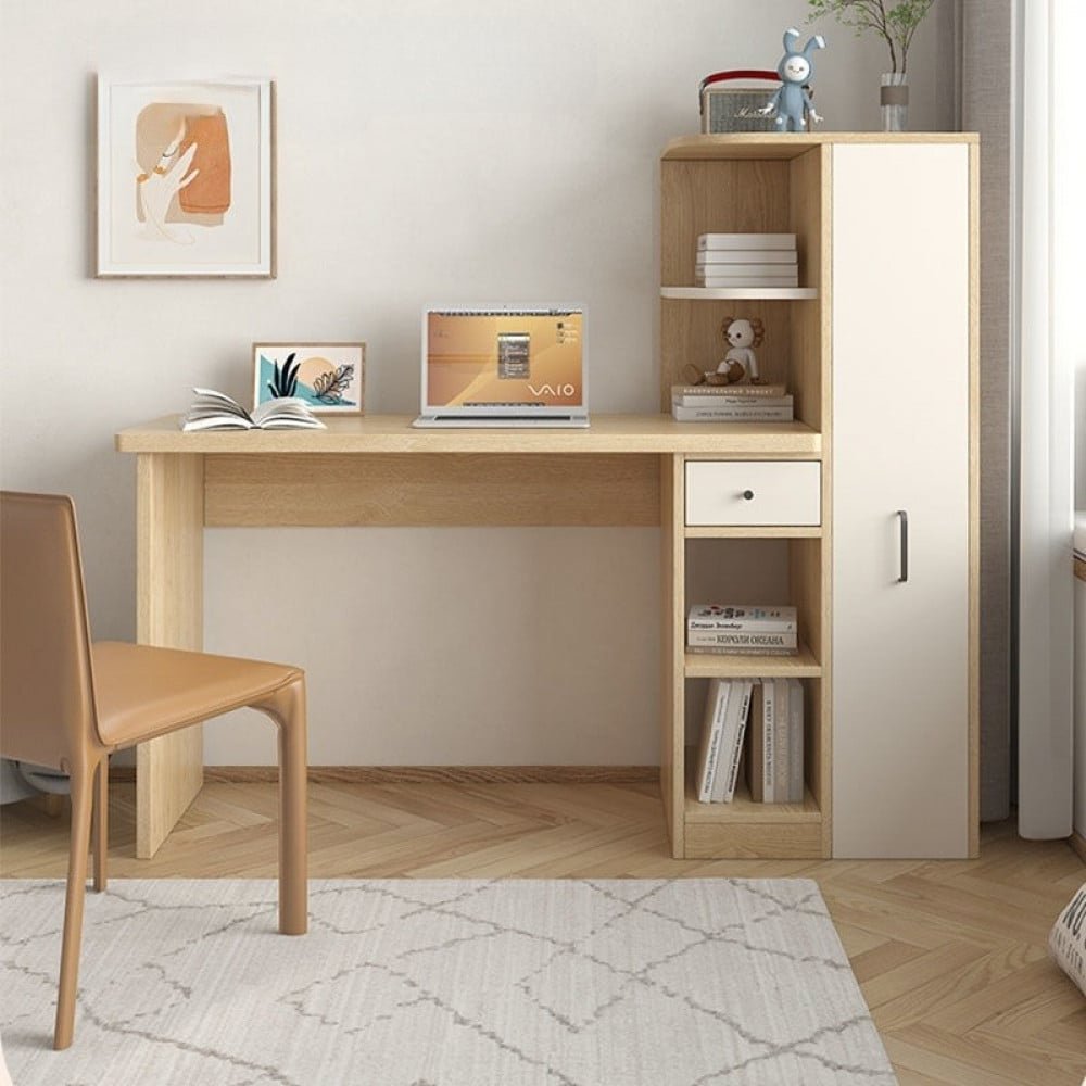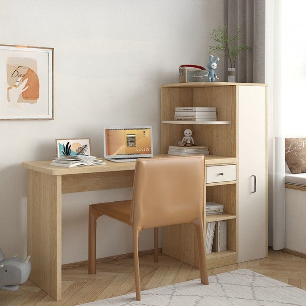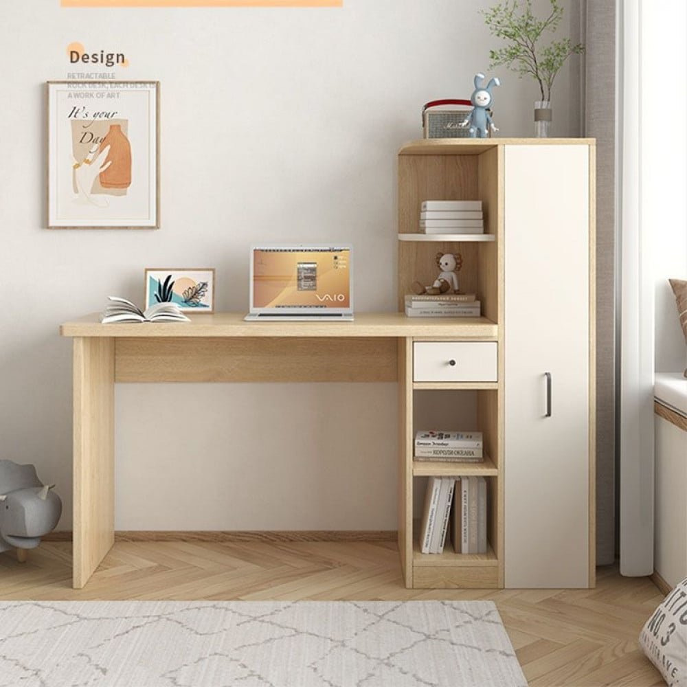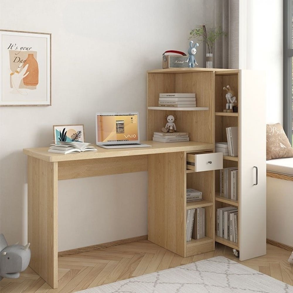 مكتب خشبي للدراسه و العمل و ايضاً يمكنك وضع الكمبيوتر الخاص بك و يتوفر به ايضا عدة ارفف و خزائن للحفاظ علي اوراقك الخاصه في مكان واحد للحفاظ عليها المكتب مصنوع بالكامل من الخشب المتين و متوفره ب اللون الخشبي و يأتي بمقاسين هما ( ارتفاع 122 سم * العرض 125 / 145 سم * العمق 45 سم )