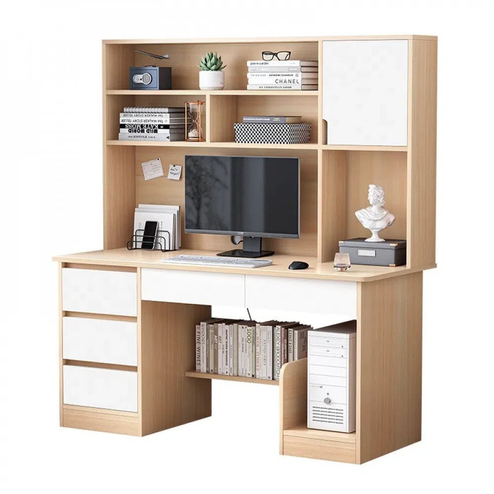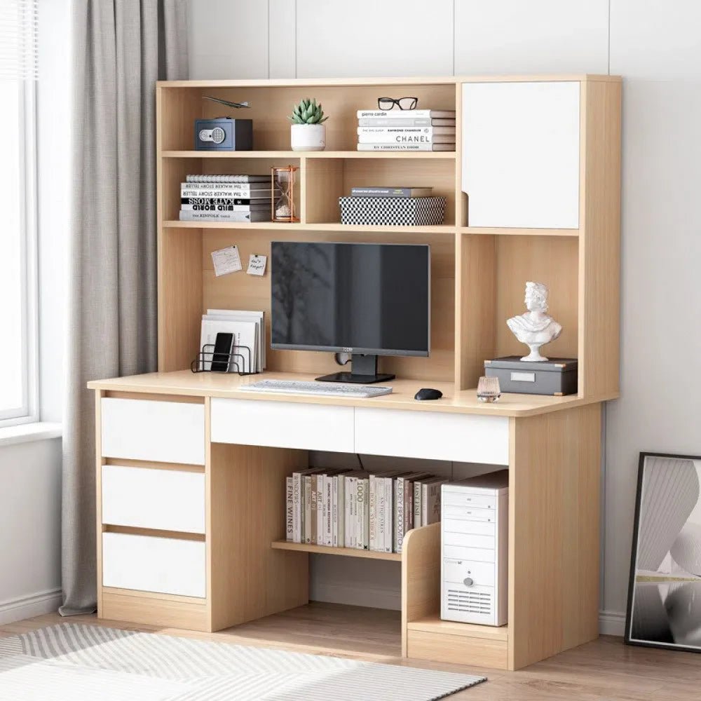 مكتب للكمبيوتر مدمج معه مكتبة . المكتب مصنوع من الخشب عالى الجودة . يأتي مع خزانة وأرفف متعددة ودرج لمزيد من مساحات التخزين .